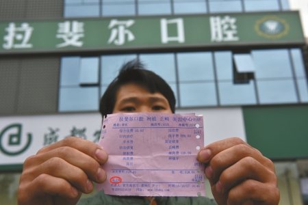 26歲的小姜在成都工作,住在姐姐家。一顆緊靠盡頭牙的左下牙把小姜折磨了近一年,平日他只是弄點(diǎn)含片“對付對付”。10月27日,小姜終于決定“來個徹底根治”。當(dāng)天下午1點(diǎn)過,他問姐姐要了300塊錢后,來到位于高新區(qū)府城大道的拉斐爾口腔醫(yī)院。