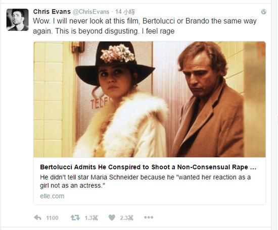 《美國隊長》克里斯·埃文斯(Chris Evans)也表示:“天啊,我再也無法像過去那樣看待這部片子、貝托魯奇或白蘭度,這已經(jīng)超越了惡心,我覺得很憤怒!”他的發(fā)文也引來許多網(wǎng)友認同,連《歌喉贊》女主角安娜·肯德里克(Anna Kendrick)也在底下回應(yīng)表示,“施耐德女士之前曾在訪談中說過,‘我曾提起過這件事情,聽的人(男人們)還翻白眼’?!?/p>