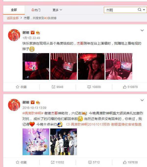 目前,在謝娜的微博中搜索“張杰”,顯示0條;搜索“杰哥”,出現(xiàn)43條,最近的一條是1月1日。