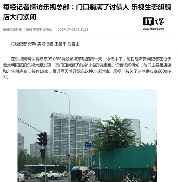 樂視最近可謂麻煩不斷,在確認(rèn)賈躍亭99.06%持股被凍結(jié)后,據(jù)每日經(jīng)濟新聞報道,位于北京朝陽區(qū)的樂視大廈門口躺滿了前來討債的供應(yīng)商。