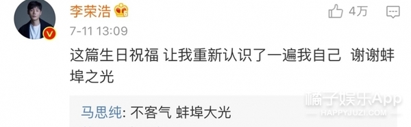 隨后李榮浩就在底下評(píng)論說(shuō)馬思純的這篇生日祝福讓他重新認(rèn)識(shí)了自己,還稱她為“蚌埠之光”。而馬思純也回復(fù)他說(shuō)“不客氣,蚌埠大光。”