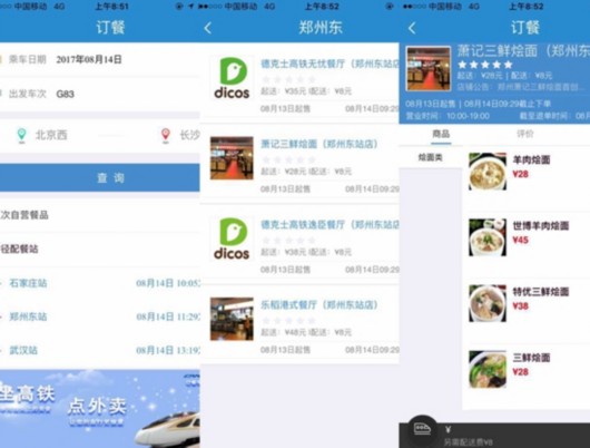 基于手機(jī)高鐵購票APP,消費(fèi)者打開之后轉(zhuǎn)到商旅服務(wù)一欄找到訂餐服務(wù),在上面輸入乘車日期和車次之后就能選擇餐點(diǎn),再填寫姓名和座位號等信息,付款成功之后就能“坐等”外賣送達(dá)手中。