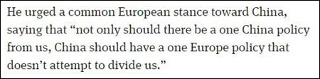 他說:“不能只是要求我們堅持一個中國原則;中國也應(yīng)當堅持一個歐洲的立場,不能試圖分裂我們。”