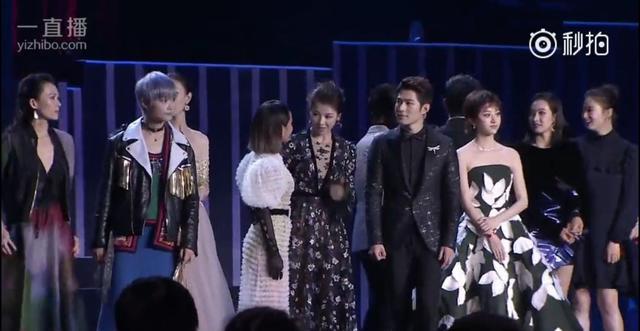 后來黃曉明隊和吳秀波隊的人一上來,舞臺上就滿了,而張韶涵的位置從劉嘉玲的右邊換到了劉嘉玲左邊,變成在李冰冰和劉嘉玲中間。可以看到她當(dāng)時也還是挺尷尬的。然后李冰冰和張韶涵身邊的劉嘉玲握手寒暄,張韶涵尷尬的站在原地。
