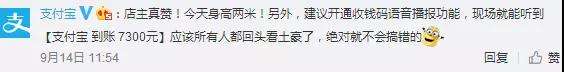 對(duì)此,支付寶官方表示,建議開通收錢碼語音播報(bào)功能,現(xiàn)場(chǎng)就能聽到“支付寶到賬7300元”,應(yīng)該所有人都回頭看土豪了,絕對(duì)就不會(huì)搞錯(cuò)的。