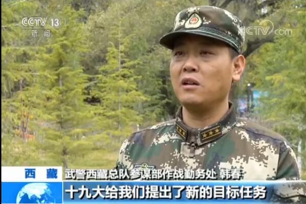 武警西藏總隊(duì)參謀部作戰(zhàn)勤務(wù)處 韓春:十九大給我們提出了新的目標(biāo)任務(wù),在新時(shí)代,作為守衛(wèi)祖國(guó)邊疆的武警官兵,按照習(xí)主席講的那樣,一定要有新氣象新作為,始終扎根高原、立足崗位,為實(shí)現(xiàn)強(qiáng)軍目標(biāo)作出積極貢獻(xiàn)。