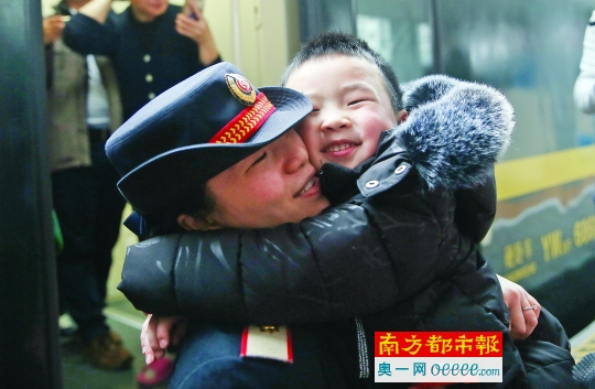 2月10日16時57分,深圳開往烏魯木齊的Z 230次列車??亢怅栒?,由知名導(dǎo)演陳可辛執(zhí)導(dǎo)的短片《三分鐘》原型列車員劉鐘與兒子丁丁在站臺短暫相聚三分鐘。緊緊的相擁后告別在即,劉鐘眼中含淚,她還要上班至15日。不過,讓劉鐘特別開心的是今年她終于可以回家過除夕,這是11年來第一次。 南都記者 馬強 攝