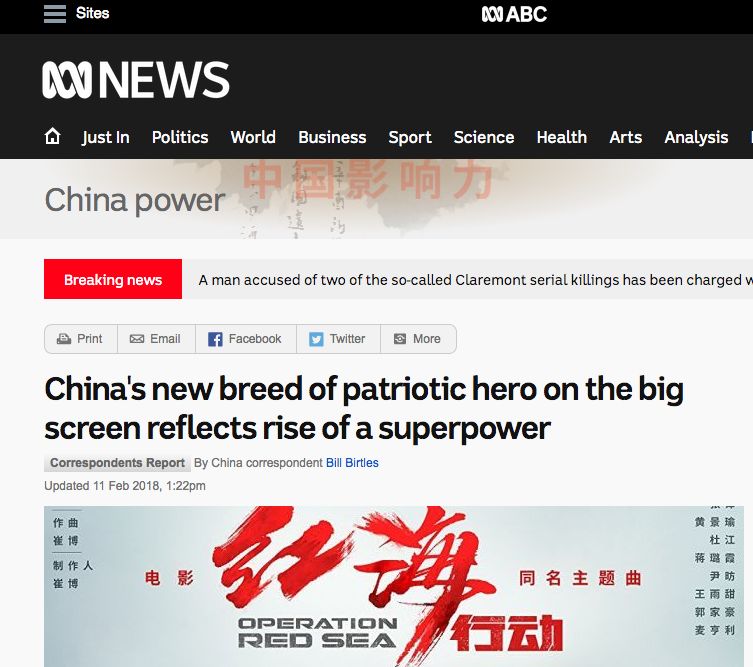 澳大利亞廣播公司新聞網(wǎng)分析稱,中國大銀幕上的新型愛國英雄反映了一個超級大國的崛起。作為中國強(qiáng)大外交自信在電影領(lǐng)域的展現(xiàn),銀幕英雄將會越來越多的揮舞著中國旗幟。