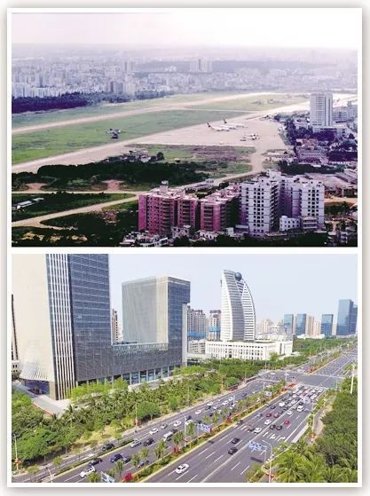 拼版照片為??谑袊d大道,曾經(jīng)是海口大英山機(jī)場(上圖為1999年5月新華社記者姜恩宇攝,下圖為2018年4月14日新華社記者郭程攝)。 新華社發(fā)