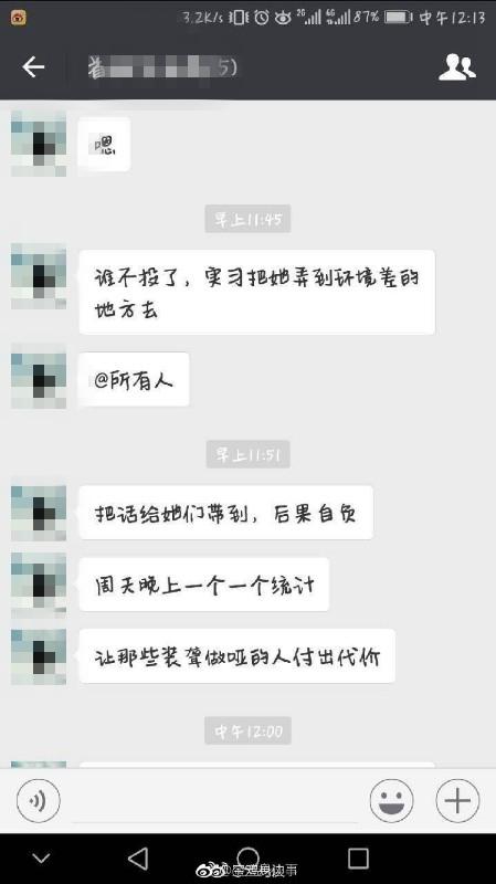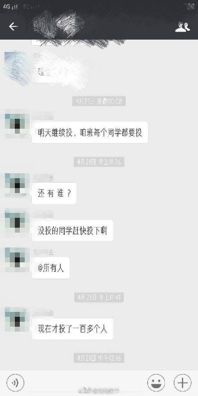 該網(wǎng)友提供的聊天截圖顯示,一個昵稱叫“大江東去”的人4月21日在班級微信群中說“明天繼續(xù)投,咱班每個同學(xué)都要投”“沒投的同學(xué)趕快投下”“現(xiàn)在才投了一百多個人”。在另一個名叫“首腦交流群”的微信群中,“大江東去”對班干部說:“誰不投了,實習(xí)把她弄到環(huán)境差的地方去”“把話給她們帶到,后果自負”“周天晚上一個一個統(tǒng)計”“讓那些裝聾作啞的人付出代價”。