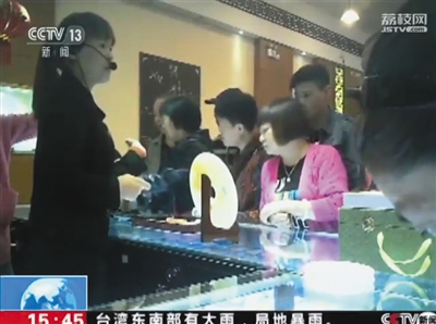 6月15日,央視“新聞直播間”節(jié)目中,游客在珠寶飾品店內(nèi)選購商品。視頻截圖