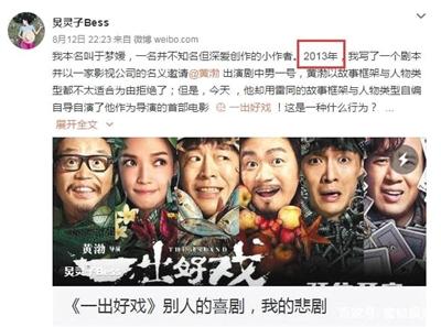 上映4天,黃渤導(dǎo)演的處女作《一出好戲》票房破6億。然而,8月12日晚,一位名叫于夢(mèng)媛的編劇在微博發(fā)文稱(chēng),黃渤的《一出好戲》涉嫌抄襲她2013年寫(xiě)的劇本《男人危機(jī)》。她在文中說(shuō)道:“2013年,我寫(xiě)了一個(gè)劇本并以一家影視公司的名義邀請(qǐng)黃渤出演劇中男一號(hào),黃渤以故事框架與人物類(lèi)型都不太適合為由拒絕了;但是,今天他卻用雷同的故事框架與人物類(lèi)型自編自導(dǎo)自演了他作為導(dǎo)演的首部電影《一出好戲》!”新京報(bào)第一時(shí)間聯(lián)系了黃渤導(dǎo)演以及編劇于夢(mèng)媛,兩人均未做出回應(yīng);隨后又聯(lián)系了當(dāng)時(shí)參與《男人危機(jī)》籌備工作的工作人員張進(jìn)(化名),還原了當(dāng)時(shí)的一些事情經(jīng)過(guò)。