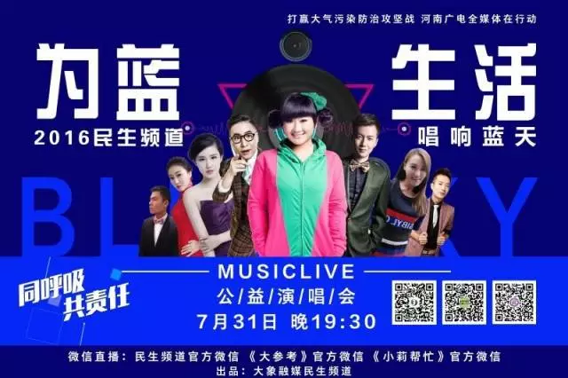 同呼吸,共責(zé)任,打贏大氣污染防治攻堅戰(zhàn),河南廣電全媒體在行動,為藍生活唱響藍天,2016民生頻道MUSIC LIVE公益演唱會7月31日晚19:30,喚醒你的雙耳,等你來聽……
