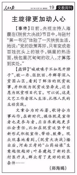 作為十九大的重要獻(xiàn)禮篇,《脫貧大決戰(zhàn)》第二季于10月11日正式播出。從第一季的“認(rèn)識貧困、了解貧困”,到第二季的“幫扶貧困、解決貧困”,固本求新,展現(xiàn)扶貧工作的現(xiàn)實(shí)意義和顯著成效,彰顯河南在全國脫貧攻堅(jiān)中的責(zé)任和擔(dān)當(dāng)。節(jié)目播出之后,《光明日報》刊發(fā)《“土氣”背后的擔(dān)當(dāng)精神——關(guān)于大型公益扶貧節(jié)目<脫貧大決戰(zhàn)>》?!度嗣袢請蟆钒l(fā)表評論《主旋律更加動人心》,稱贊《脫貧大決戰(zhàn)》是“深入生活、扎根人民的生動實(shí)踐”,國務(wù)院扶貧辦、中宣部、省委省政府、省委宣傳部等多個領(lǐng)導(dǎo)對節(jié)目給予充分肯定。