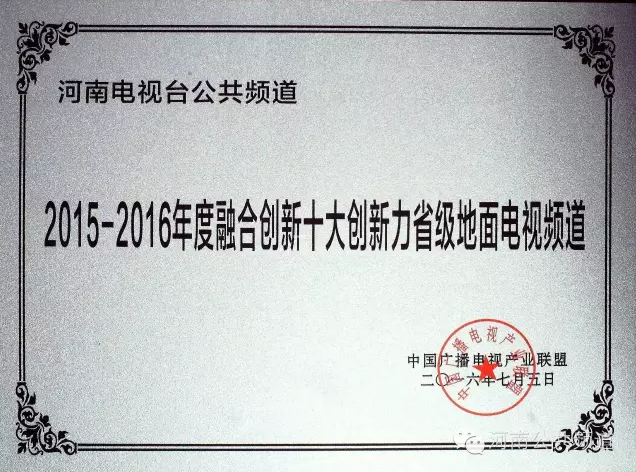 7月9日至12日,2016全國電視節(jié)目模式創(chuàng)新交流年會(huì)在黑龍江省黑河市舉行。河南電視臺(tái)公共頻道榮獲2015-2016年度融合創(chuàng)新十大創(chuàng)新力省級(jí)電視頻道。