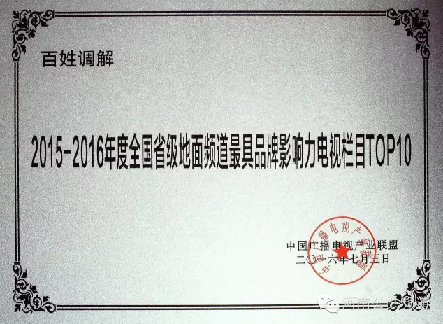 《百姓調(diào)解》欄目榮獲2015-2016年度全國省級(jí)地面頻道最具品牌影響力電視欄目TOP10。