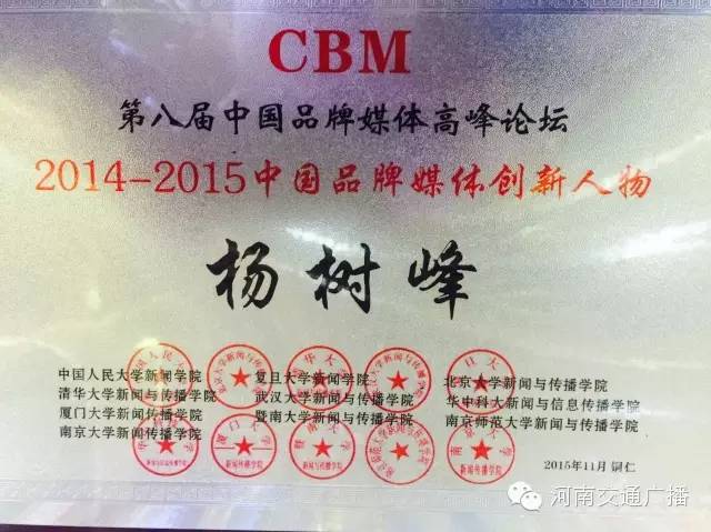 本屆論壇上,河南交通廣播總監(jiān)楊樹峰榮獲2014-2015中國品牌媒體創(chuàng)新人物稱號,這是對他個人成就的肯定,更體現(xiàn)了河南交通廣播運管機制的成功,人文關懷、扁平化管理,民主決策、智慧碰撞,從決策層發(fā)出的指令,成為掌控河南交通廣播精準運行,走向成功的靈魂,而我們一切的努力,都是為了實現(xiàn)一個目標:無論何時、何地,無論現(xiàn)在、未來,伴你出行每一刻。