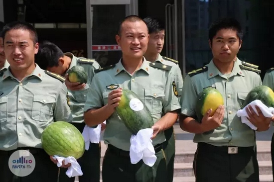 我們給他們每人都送了一個西瓜,遞到他們手里跟他們說:“你們辛苦了!”的時候,我們明顯能夠感覺到他們的喜悅,他們飽經(jīng)風(fēng)霜的臉上洋溢的笑容,讓人覺得特別溫馨、真誠。