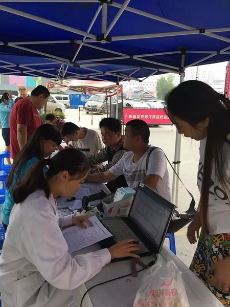 早上九點(diǎn)多,獻(xiàn)血車剛剛停放好就有聽眾頂著蒙蒙細(xì)雨來獻(xiàn)血了。