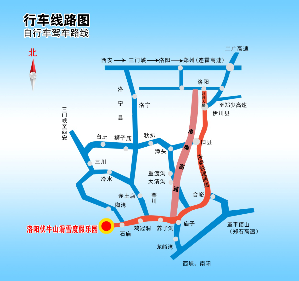 洛陽(yáng)-嵩縣-欒川縣城-欒川石廟鎮(zhèn)-滑雪場(chǎng)(140公里)。2、鄭州-新密-登封-伊川-嵩縣-欒川縣城-欒川石廟-滑雪場(chǎng)(260公里)。