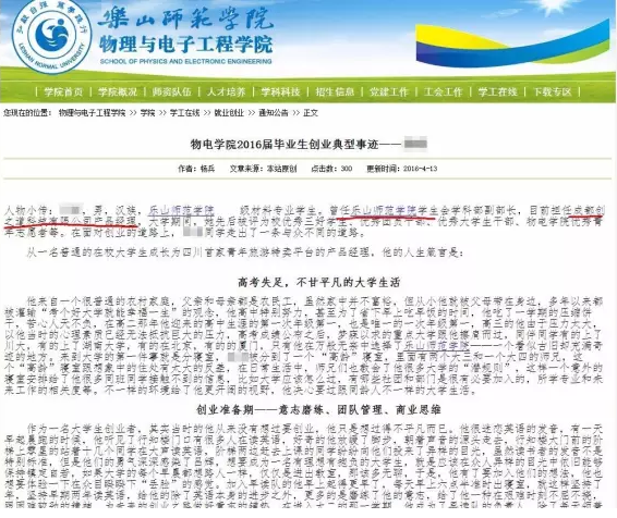 樂山師院學(xué)院官網(wǎng)上貼出的關(guān)于李飛創(chuàng)業(yè)的典型事跡