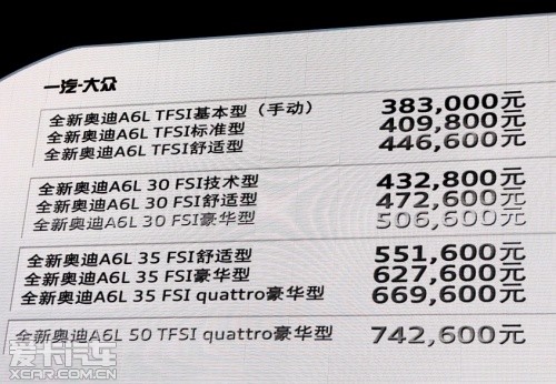 | 全新奧迪A6L車型 | 官方指導(dǎo)價(萬元) |