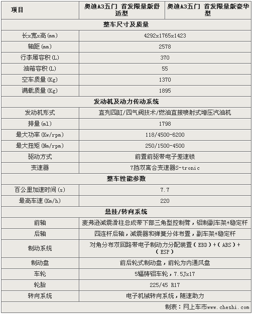 奧迪A3作為奧迪即將引入國內的入門級車型,將于下個月正式上市發(fā)布。奧迪A3先期將首推兩款搭載1.8TFSI的五門版車型,分別為奧迪A3五門首發(fā)限量版舒適型和首發(fā)限量版豪華型。通過以下的官方參數(shù)和配置曝光,讓我們提起一睹奧迪A3到底具備怎樣的性能。