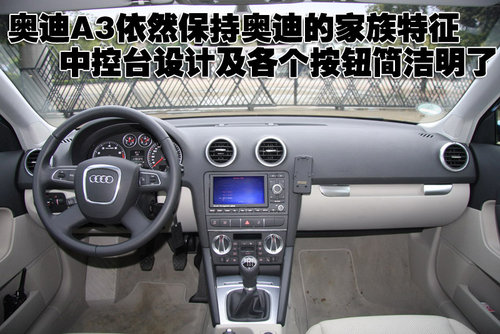 奧迪A3依然保持奧迪的家族特征,中控臺設計及各個按鈕簡潔明了。其四輻式真皮方向盤配備集成控制按鈕,而白色冷光儀表盤突出視覺效果的同時,又方便駕駛員讀取信息。