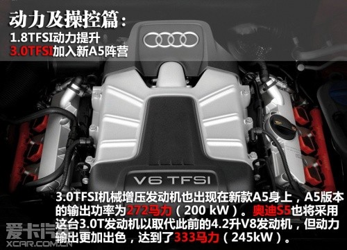 入門級的奧迪A5將采用1.8TFSI發(fā)動機,重新調(diào)教后,動力輸出從158馬力提高到168馬力。2.0 TFSI發(fā)動機的動力輸出依舊為211馬力(155kW)。3.0TFSI機械增壓發(fā)動機也出現(xiàn)在新款A(yù)5身上,A5版本的輸出功率為272馬力(200 kW)。奧迪S5也將采用這臺3.0T發(fā)動機以取代此前的4.2升V8發(fā)動機,但動力輸出更加出色,達到了333馬力(245kW)。變速箱方面,與以上幾款發(fā)動機匹配的將有6速手動、無級變速器、7速S tronic三種。