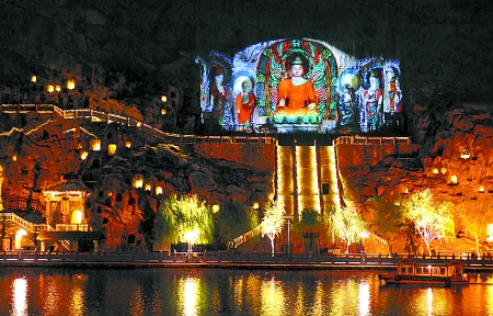 4月13日晚,河南洛陽(yáng)龍門景區(qū)進(jìn)行了景區(qū)亮化工程提升后的首次試燈。2011年12月開始,龍門石窟景區(qū)進(jìn)行亮化提升,目前,景區(qū)內(nèi)的所有燈光已調(diào)試就緒,將于近期正式對(duì)游人開放。 新華社發(fā)