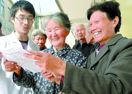 4月26日,湯陰縣白營(yíng)鄉(xiāng)東木佛村老人們正在看自己的體檢報(bào)告。4月份,湯陰縣5萬多名60歲以上農(nóng)村老人享受到了一次免費(fèi)健康體檢,體檢費(fèi)用由政府買單。 常中正 攝
