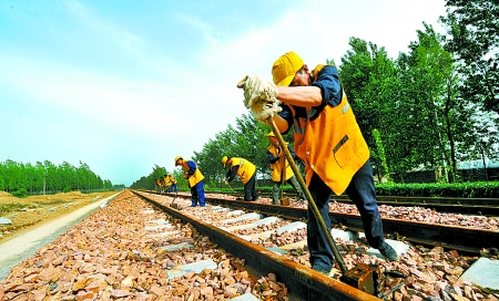 4月27日,我省鐵路工人正在山西中南部鐵路大通道河南濮陽段施工現(xiàn)場,對剛鋪設的道軌進行修整。該鐵路大通道濮陽段自開工以來已完成投資31.68億元,完成路基土石方889.89萬方、橋梁21026米、涵洞5802米、鋪軌166公里。該鐵路建成通車后將成為我國第一條真正意義上的重載鐵路。高 林 劉榮莉 攝