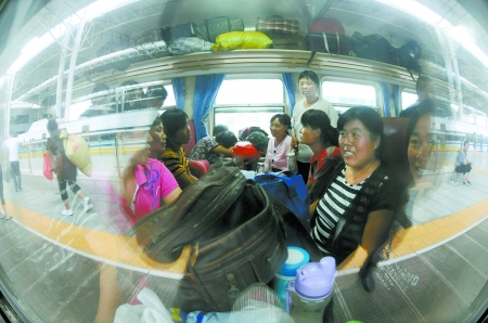 據(jù)鄭州鐵路局介紹,8月20日到9月11日,鄭州鐵路局加開了23趟棉農(nóng)專列運(yùn)送摘棉工進(jìn)疆。為方便棉農(nóng)就近上車,節(jié)約棉農(nóng)旅途成本,這些列車將分別從棉農(nóng)較集中的商丘、許昌、寧陵、蘭考等車站始發(fā)。 (趙鵬 攝)