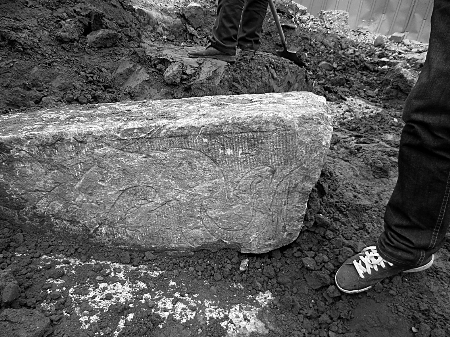 昨日上午,記者來到發(fā)現(xiàn)古墓的施工現(xiàn)場,南陽市文物考古研究所考古人員已經(jīng)進駐該工地,著手發(fā)掘工作。這座古墓位于該市臥龍路與車站路交叉口南側約700米處,4塊大小不一、形狀各異的大青石散落在工地中央,其中兩塊仍半掩在泥土中,依稀能看到上面刻有圖案(如圖),現(xiàn)場還有不少灰色磚塊。