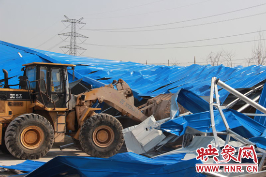 “轟”的一聲,位于滎陽市京城辦康砦村龍港路段南側(cè)附近一個(gè)私自搭建的彩鋼瓦棚被鏟車鏟倒,標(biāo)志著京城路街道拆除違法占地、違法建筑活動(dòng)的正式開始。