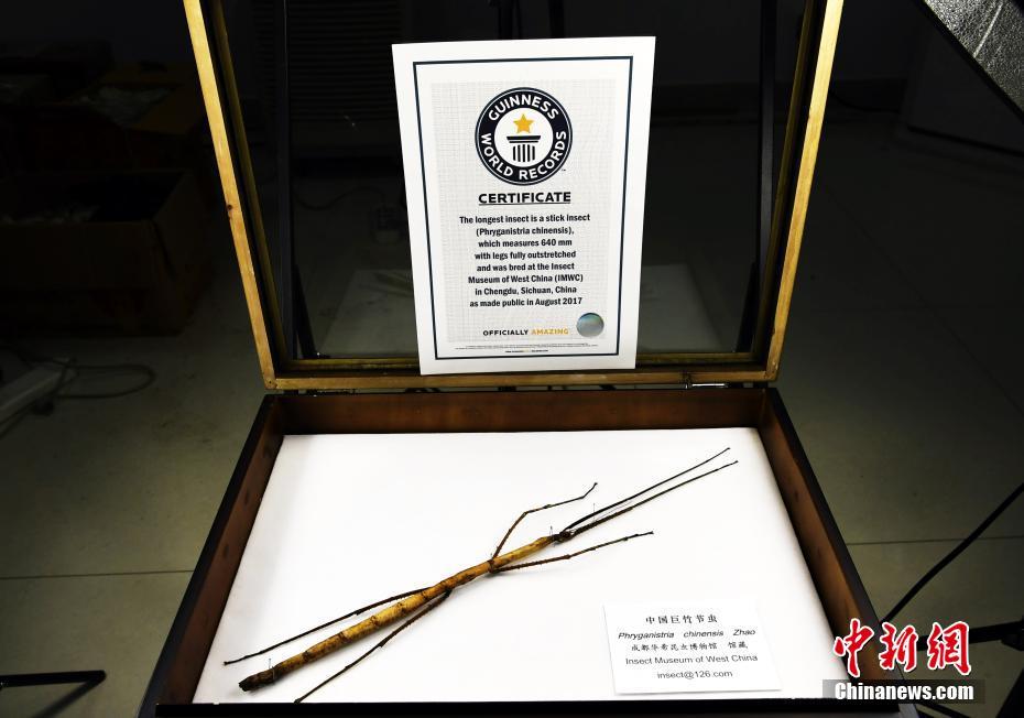 成都華希昆蟲(chóng)博物館里的一只中國(guó)巨型竹節(jié)蟲(chóng)是吉尼斯世界紀(jì)錄“最大昆蟲(chóng)”保持者,該蟲(chóng)的第一顆卵于近期成功孵化出幼蟲(chóng)。