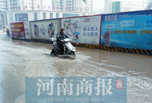 3月26日,鄭州晴空萬里,然而紫荊山路上卻多出一條百米長“河”。當(dāng)天上午12時,紫荊山路與東大街交叉口,北向南方向的綠燈亮后,行人穿過東大街,卻被路南的一條“河”攔住去路。