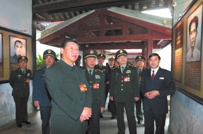 10月31日上午,習近平帶領全體中央軍委委員一起參觀會址。習近平來到當年毛澤東作政治報告的廳堂,凝望著廊柱上富有鮮明戰(zhàn)斗性的標語,注視著當年會議代表取暖留下的斑斑炭火印跡,同大家一起回憶先輩們探尋革命道路時篳路藍縷、艱辛奮斗的情景,并向大家介紹他每次來古田參觀的情形和感受。
