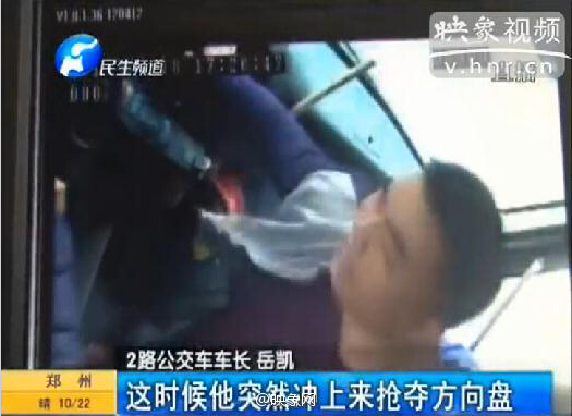 監(jiān)控顯示,鄭州2路公交車正常行駛中,突然一男子沖上來猛拉方向盤,并與公交車長廝打在一起。男子將車長狠狠地壓在方向盤上,無法動彈。而其動手的原因竟是因?yàn)樽^了站,車長沒有及時(shí)給他開門。事后,民警對此事進(jìn)行了調(diào)解。