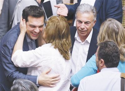 11日,希臘議會通過旨在解決債務問題的新協(xié)議草案,議員擁抱總理齊普拉斯表示祝賀。