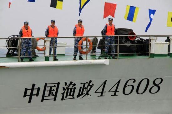 資料圖片:2013年3月30日,赴黃巖島護漁執(zhí)法中國漁政44608船駛?cè)肷穷^海灣。當日上午,中國漁政44608船歷時23天、順利完成黃巖島護漁執(zhí)法巡航任務(wù)返回廣東汕頭港。新華社發(fā)(姚軍 攝)