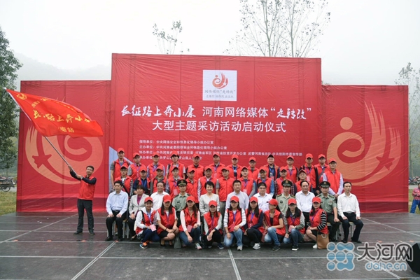 出席“長(zhǎng)征路上奔小康”河南網(wǎng)絡(luò)媒體“走轉(zhuǎn)改”大型主題采訪活動(dòng)啟動(dòng)儀式的領(lǐng)導(dǎo)和嘉賓與采訪團(tuán)合影留念
