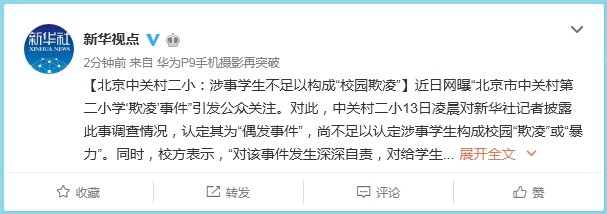 【北京中關(guān)村二?。荷媸聦W生不足以構(gòu)成“校園欺凌”】近日網(wǎng)曝“北京市中關(guān)村第二小學‘欺凌’事件”引發(fā)公眾關(guān)注。對此,中關(guān)村二小13日凌晨對新華社記者披露此事調(diào)查情況,認定其為“偶發(fā)事件”,尚不足以認定涉事學生構(gòu)成校園“欺凌”或“暴力”。同時,校方表示,“對該事件發(fā)生深深自責,對給學生及家長帶來的傷害,深表歉意”,將汲取教訓,以此為鑒,本著認真理性、客觀公正的原則,妥善處理。(新華社記者魏夢佳、梁天韻)