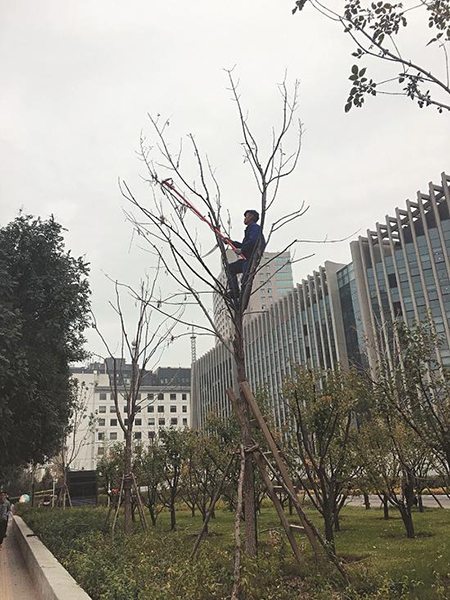 老段正在修剪的是一棵白蠟樹,是今年新栽的,5米多高,樹冠比較大,樹枝的枝杈也很多,但是樹葉很少?!靶略缘陌紫?,樹葉還沒長,今年修剪完,明年就長得好看了?!崩隙握f,新栽的樹一般都要在栽種處提前挖個土丘,可是因為根系被破壞了,水分吸收得少,原先的樹枝多,營養(yǎng)就不夠用。