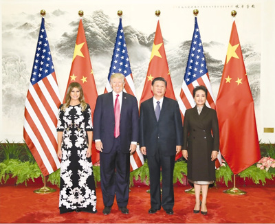 11月9日,國家主席習(xí)近平在北京人民大會堂東門外廣場舉行歡迎儀式,歡迎美利堅合眾國總統(tǒng)唐納德·特朗普對中國進(jìn)行國事訪問。這是習(xí)近平和夫人彭麗媛在人民大會堂同特朗普夫婦合影。