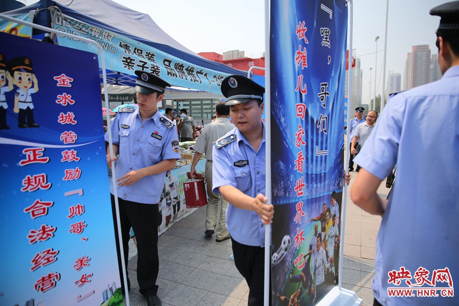 映象網(wǎng)訊 (記者 閆善良 文/圖)“你家人造(知道)嗎?”、“西班牙、英格蘭都回家了。哥們......咱也不在這添堵啦!”、“哥、姐,嫩(你們)別給這兒添堵啦?!薄ⅰ昂?,哥們!收攤兒回家看世界杯吧!”、“帥哥、美女,正規(guī)合法經(jīng)營?!?、“金水城管告知您,醬紫(這樣子)不合適?!?月2日上午10時(shí)20分,鄭州市紫荊山地鐵站出入口,用網(wǎng)絡(luò)流行語寫成的十多塊宣傳板,呈弧形圍在一個(gè)占道經(jīng)營商販的周圍,引來眾多市民圍觀。
