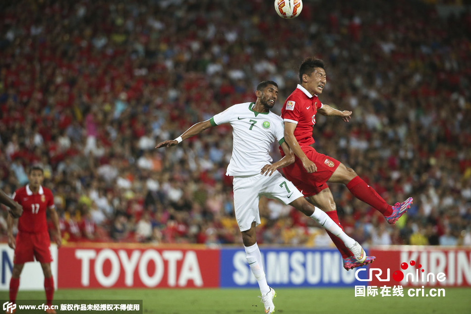 比賽第11分鐘,蒿俊閔在前場左路被對方放倒,中國隊獲得前場任意球,蒿俊閔選擇直接攻門,由于距離較遠被沙特門將攬入懷中。第13分鐘,中國隊吉翔右路傳中,落點十分精確,包抄的于海在對手后衛(wèi)的干擾中沒能射中球門。