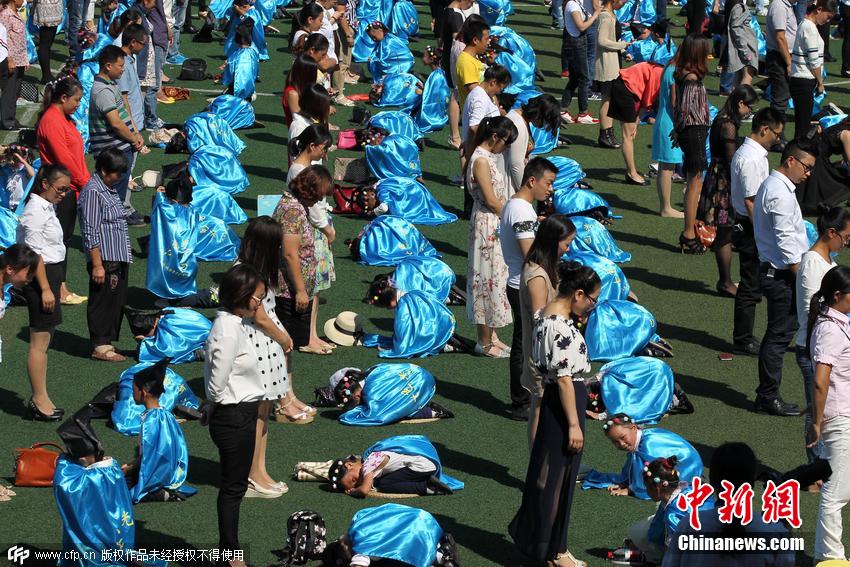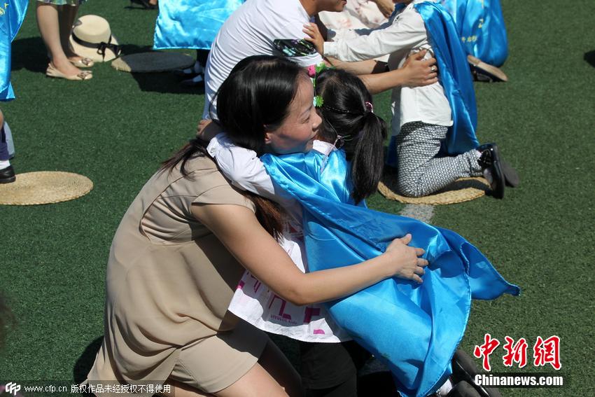 2015年9月10日,江蘇南通,北城小學舉行“點亮成長中的每個日子”大型入學儀式,532名新生和家長一起參加“感恩禮”、“拜師禮”和“開筆禮”等獨具特色的新生入學禮,讓學生體驗傳統(tǒng)禮儀,將好學、尊師孝親等中華傳統(tǒng)美德融入到學習和生活中。圖為一年級學生跪在蒲墊上行感恩禮,與父母擁抱。 圖片來源:CFP視覺中國