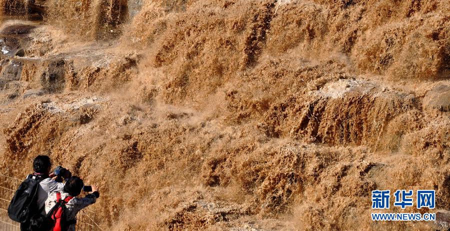 9月13日,游客在山西省吉縣黃河壺口瀑布景區(qū)觀賞瀑布。近日,受上游降雨和水庫調(diào)節(jié)放水影響,黃河干流迎來秋汛,位于山西吉縣和陜西宜川縣交界的壺口瀑布水量大增,形成壯美瀑布,吸引眾多游人前來觀瀑。新華社發(fā)(呂桂明 攝)