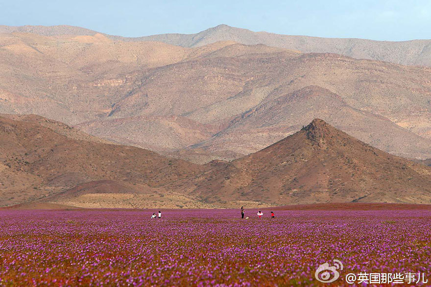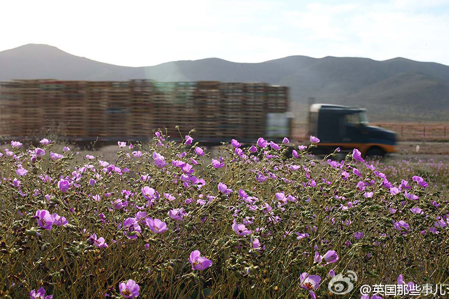 智利阿塔卡馬沙漠本是世界上最干燥的沙漠,今年的厄爾尼諾現(xiàn)象帶來了一場超乎以往的大雨,沙漠土地里休眠的各種花朵種子瞬間發(fā)芽、生長、開花,在這以往死寂的沙漠綻放。